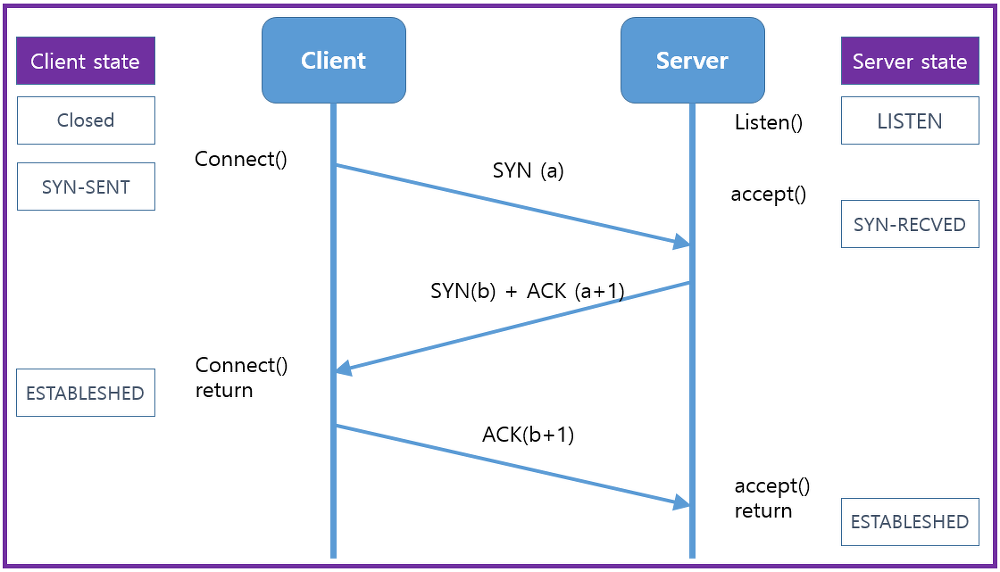 TCP/IP프로토콜을 이용한 통신을 하는 응용프로그램이 데이터를 전송하기전에 정확한 전송을 보장하기 위해 상대방 컴퓨터와 사전에 세션을 수립하는 과정을 의미합니다.